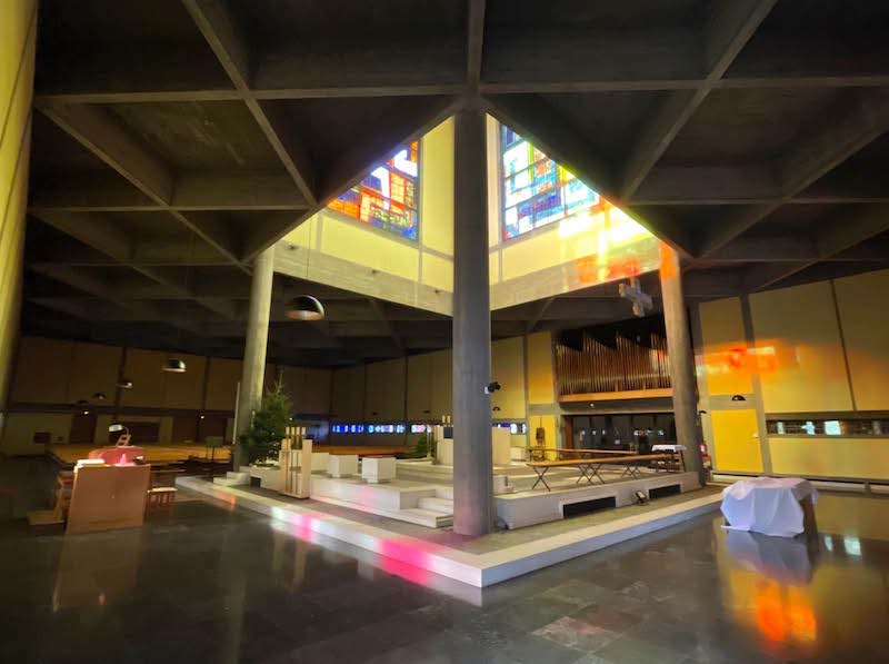 La matinée se poursuivra par la messe célébrée dans l’église du Sacré-Cœur à Mulhouse, (paroisse des Portes de Mulhouse). Cet édifice moderne construit à la fin des années 1950 entre 1956 et 1960, selon les plans d’André Le Donné et Michael Patout est constituée d’une multitude de volumes de différentes hauteurs. Un large et coloré puits de lumière, placé au-dessus du chœur, attire nos regards vers le Ciel. La communauté paroissiale y accueillera les fidèles et donnera une place particulière aux catéchumènes, engagés dans la dernière ligne droite de leur parcours vers le baptême.