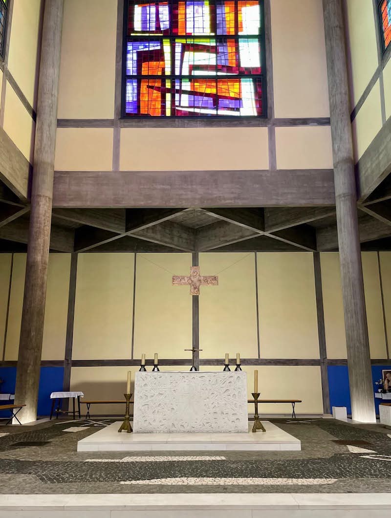 La matinée se poursuivra par la messe célébrée dans l’église du Sacré-Cœur à Mulhouse, (paroisse des Portes de Mulhouse). Cet édifice moderne construit à la fin des années 1950 entre 1956 et 1960, selon les plans d’André Le Donné et Michael Patout est constituée d’une multitude de volumes de différentes hauteurs. Un large et coloré puits de lumière, placé au-dessus du chœur, attire nos regards vers le Ciel. La communauté paroissiale y accueillera les fidèles et donnera une place particulière aux catéchumènes, engagés dans la dernière ligne droite de leur parcours vers le baptême.