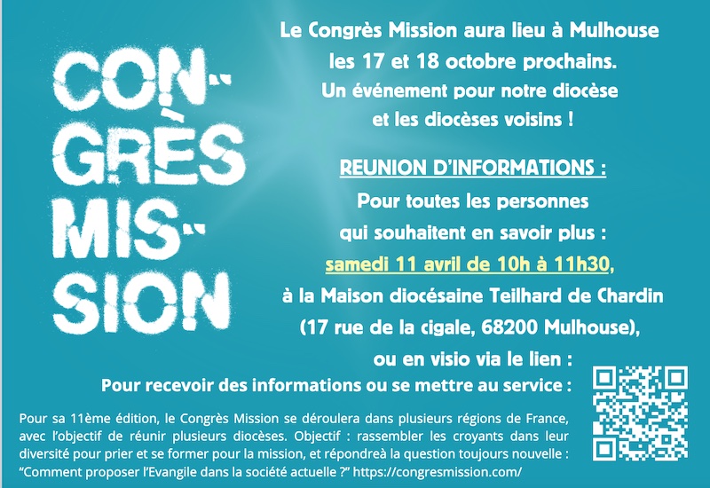 Depuis 10 ans, le Congrès Mission réuni chaque année des croyants dans leur diversité pour prier et se former pour la mission, et répondre à la question toujours nouvelle : « Comment proposer la foi dans la société actuelle ? »Réunion d’informations pour toutes les personnes qui le souhaitent : samedi 11 avril de 10h à 11h30, à la Maison Diocésaine Teilhard de Chardin, 17 rue de la cigale – 68200 Mulhouse
